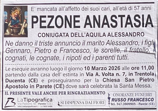 Trentola-Ducenta. Grande dolore per la comunità di Trentola-Ducenta. Una madre di famiglia si è purtroppo spenta prematuramente. Si chiamava Anastasia Pezone, aveva 57 anni.