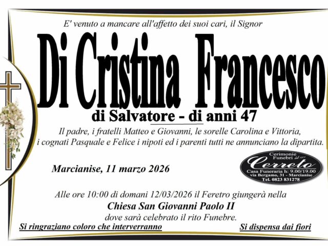 I funerali saranno celebrati domani, 12 marzo, alle ore 10, presso la chiesa di San Giovanni Paolo II a Marcianise, dove giungerà il feretro per l’ultimo saluto.