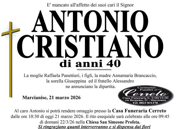 Marcianise. La città di Marcianise piange uno dei suoi figli, che se ne è andato via troppo presto, all’età di 40 anni. Si chiamava Antonio Cristiano. La sua dipartita ha colpito duramente i suoi familiari, gli amici e tutti coloro che lo conoscevano e amavano.