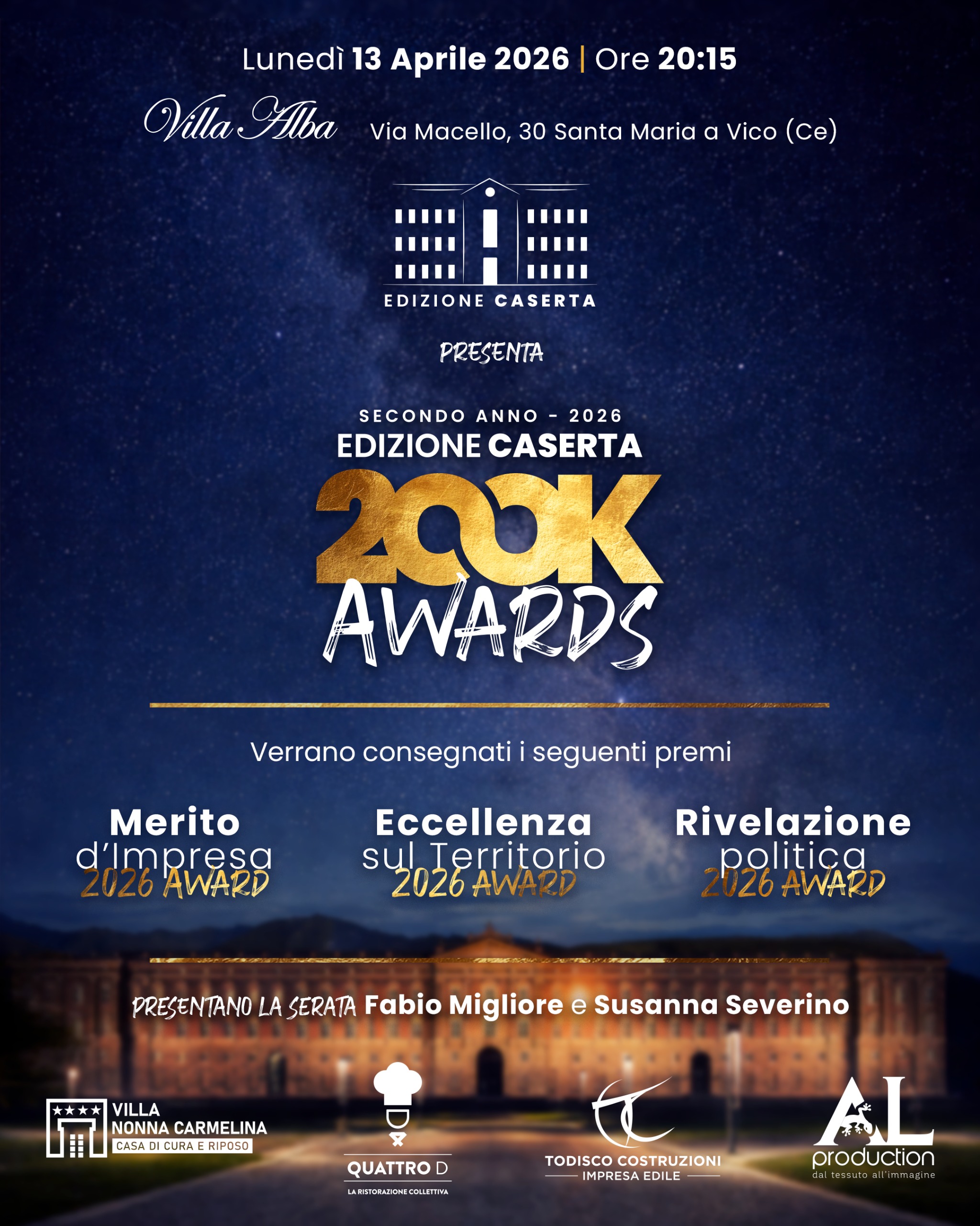 Confermata la formula delle storie live della premiazione sulle pagine di Edizione Caserta, un evento di cui sarà fornito un resoconto giornalistico e social senza precedenti che durerà nei giorni a seguire, culminando con il film degli Awards 2026.