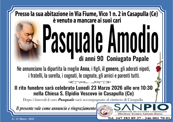 Lascia la moglie Anna, i figli, il fratello, la sorella, gli amici e i parenti, a cui la comunità si stringe per confortarli. I suoi funerali avranno luogo domani alle ore 10:30 presso la Chiesa S. Elpidio Vescovo a Casapulla.