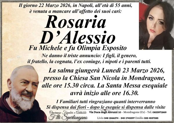 I suoi funerali saranno celebrati presso la chiesa San Nicola a Mondragone alle ore 16:30 di domani.