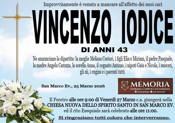 San Marco Evangelista. Una settimana fa, un militare casertano è deceduto a Roma in seguito a un terribile incidente stradale. Si chiamava Vincenzo Iodice, aveva 43 anni ed era di San Marco Evangelista. I suoi funerali sono fissati per venerdì.