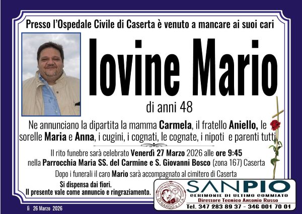 Caserta. Grande dolore oggi a Caserta. Un uomo di soli 48 anni, si è spento mentre si trovava nell’ospedale di Caserta. Si chiamava Mario Iovine. La sua scomparsa ha scosso profondamente amici e parenti ora distrutti e in lacrime.