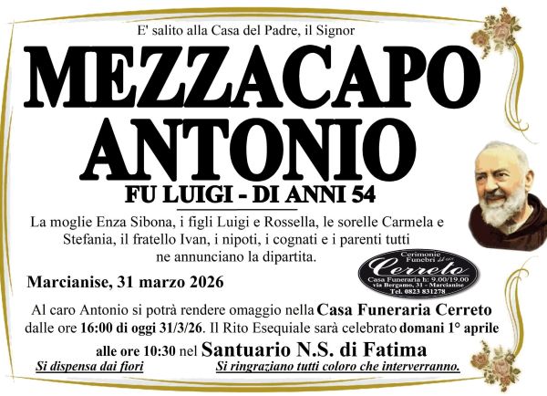 I suoi funerali saranno celebrati domani alle ore 10:30 presso il Santuario N. S. di Fatima.