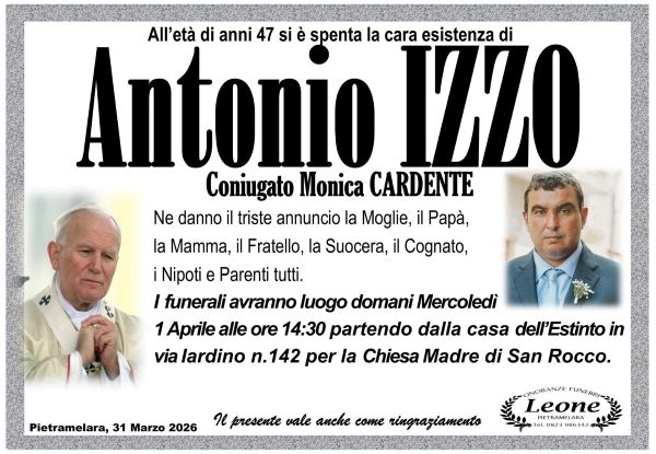 I suoi funerali saranno celebrati domani alle ore 14:30 presso la chiesa San Rocco di Pietramelara.