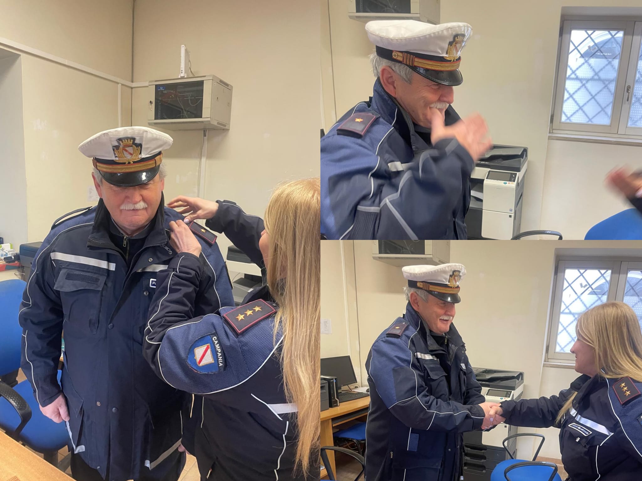 Gli è stato conferito, dalla comandante Coletta, il grado di sottotenente, per il suo lungo lavoro in strada al servizio delle persone, sempre pronto ad aiutare e disponibile.