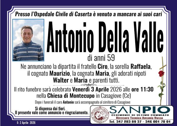 Casagiove. Grande dolore oggi per la comunità di Casagiove. Un uomo molto conosciuto e benvoluto, è purtroppo deceduto prematuramente all’età di 59 anni. Si chiamava Antonio Della Valle.