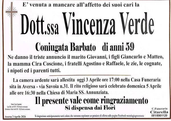 Lascia un vuoto incolmabile nelle persone che la amavano e conoscevano. La comunità si stringe ai familiari cercando di dare loro conforto e supporto. I suoi funerali avranno luogo domenica alle ore 16:30 presso la Chiesa di SS. Annunziata.