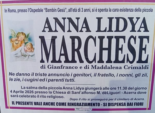 I funerali della piccola saranno celebrati durante la giornata di domani alle ore 11:30 presso la Chiesa di Sant’Alfonso M. dè Liquori ad Acerra.