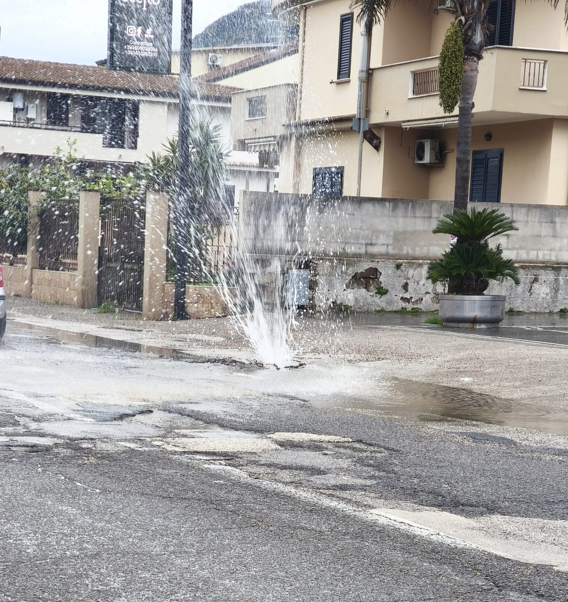 A causa della rottura, da questa mattina dall’asfalto fuoriesce acqua. Un vero e proprio geyser lungo la carreggiata e nei pressi di un noto locale, che ha allagato l’area circostante, causando disagi ai viaggiatori che si trovano a passare lungo quel tratto.