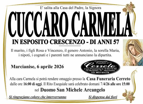 L’accaduto ha sconvolto amici e parenti, e la comunità del posto. Lascia il marito Crescenzo, i figli Rosa e Crescenzo, la sorella Maria e ii parenti. I suoi funerali avranno luogo domani alle ore alle ore 15 presso il Duomo San Michele Arcangelo.
