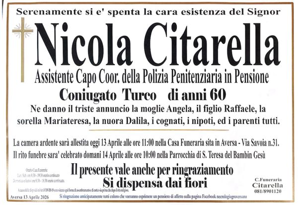 Aversa. La città di Aversa piange la prematura morte di uno dei suoi figli, l’ex Assistente Capo Coordinatore della Polizia Penitenziaria Nicola Citarella.