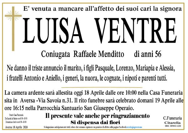 A piangere la sua scomparsa il marito Raffaele, i figli Pasquale, Lorenzo, Mariapia e Alessia, i fratelli Antonio e Aniello, e i parenti, a cui la comunità si stringe per aiutarli in un momento così difficile e doloroso.