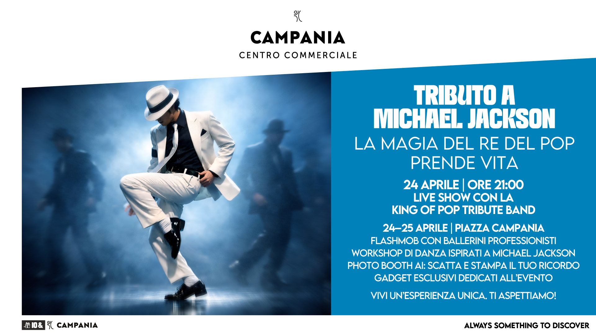 L’iniziativa è pensata come un’estensione dell’esperienza cinematografica: dopo aver vissuto l’energia e l’immaginario del re del pop in Piazza Campania, il pubblico potrà proseguire il proprio percorso nelle sale di UCI Cinemas Campania, dove il film “Michael” è in programmazione.