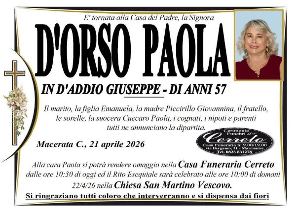 Si chiamava Paola D’Orso. Purtroppo era afflitta da un brutto male che l’ha consumata nel corso degli anni fino al tragico epilogo. Si è spenta in casa sua a Portico di Caserta, lungo via Mazzini.
