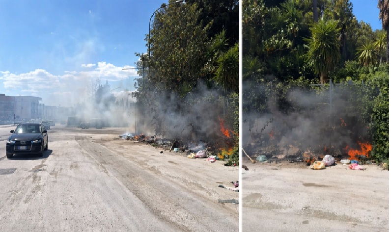 Le immagini mostrano chiaramente le fiamme che avanzano tra sacchi di immondizia, sterpaglie e materiale di vario genere, alimentando un rogo che ha interessato anche la vegetazione circostante. Il vento ha contribuito a spingere il fumo sulla strada, creando disagi alla circolazione e costringendo molti automobilisti a rallentare.