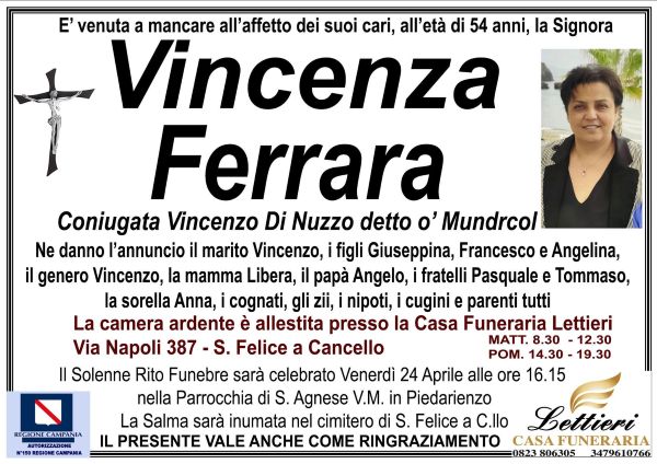 San Felice a Cancello. Grande dolore a Piedarienzo, frazione di San Felice a Cancello. Una madre di famiglia è purtroppo venuta a mancare prematuramente. Si chiamava Vincenza Ferrara, aveva 54 anni.