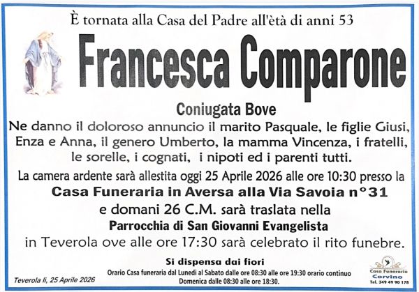 Si chiamava Francesca Comparone, aveva 53 anni. La sua perdita ha distrutto il marito Pasquale, le figlie Giusi, Enza e Anna, la madre Vincenza, le sorelle, e i parenti. Era nota per essere una donna dal carattere gentile e dolce, una persona perbene, sensibile, madre e moglie amorevole.