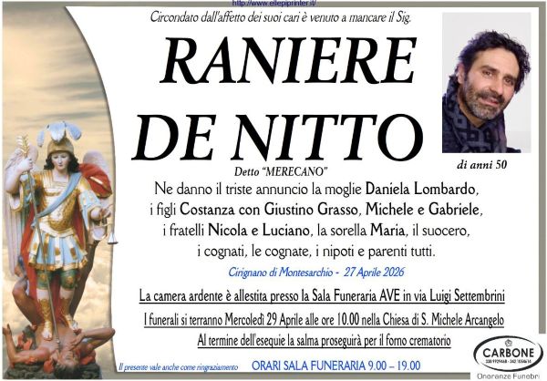 I suoi funerali saranno celebrati domani alle ore 10 presso la Chiesa di San Michele Arcangelo