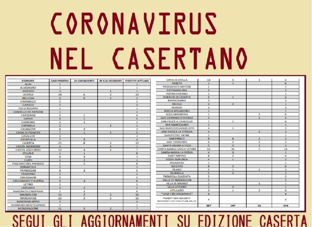 CASERTA. Sei casi positivi in più rispetto a ieri, ma un numero importante di guariti e purtroppo un altro…