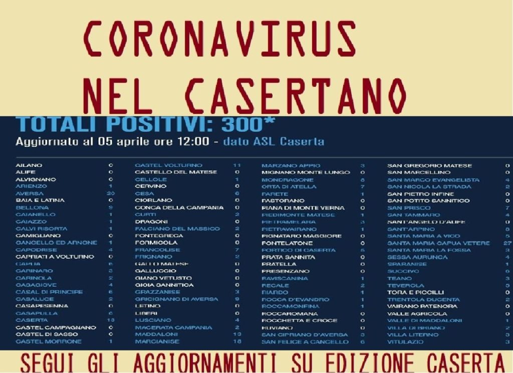 CASERTA/PORTICO/S. MARIA C.V. Raggiunge quota 300 casi la provincia di Caserta. Il Comune che fa registrare l’incremento più…