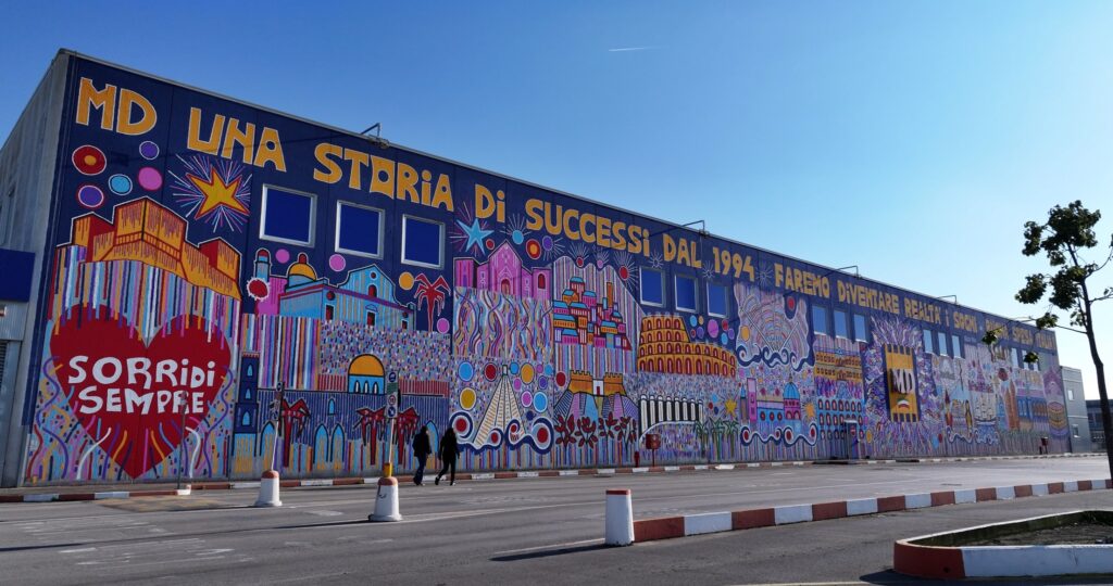 Gricignano d’Aversa. MD festeggia i suoi primi trent’anni con un murale grande 1000 metri quadri su una parete esterna della sua…
